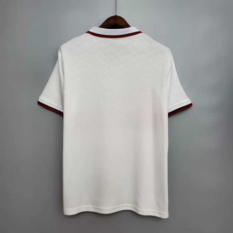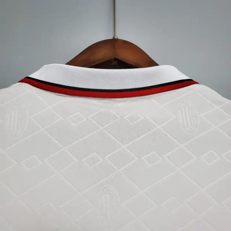 The AC Milan 1993-94 Away Kit is a standout example of football heritage, showcasing a unique and bold design. Worn by legends like Franco Baresi, Paolo Maldini, Roberto Donadoni, and Marco van Basten, this retro kit features a vibrant white base with bold red and black accents that make it instantly recognizable. The Adidas branding and the OPEL sponsor logo add to the classic jersey look. A true vintage jersey, this classic kit is a symbol of Milan’s success during the 1994 season, including their iconic Champions League victory, and remains a must-have for fans of retro jerseys.