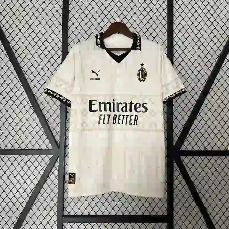 The AC Milan x Pleasures White Jersey – Fan Version is a striking blend of football heritage and modern streetwear style. This retro kit collaboration between AC Milan and the fashion brand Pleasures offers a fresh take on the traditional Milan jersey with a bold, minimalist design. The white base is paired with red and black accents, making it a clean and stylish classic jersey. Perfect for fans who appreciate both the club’s history and contemporary fashion, this vintage jersey embodies the spirit of Milan while offering a unique twist for those who love retro jerseys. A must-have classic kit for collectors and streetwear enthusiasts alike.