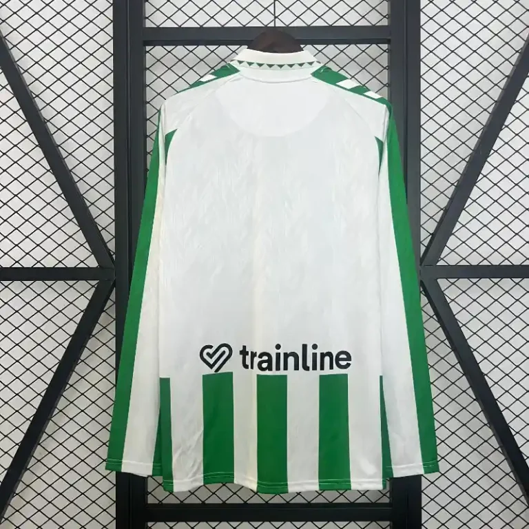The Real Betis 24/25 Home Kit – Long Sleeve – Fan Version beautifully blends the club’s rich football heritage with modern design. Featuring the classic green and white stripes, this retro jersey captures the timeless identity of Real Betis, evoking memories of legendary players who wore similar kits in the past. The long sleeve design offers added comfort, while the sharp V-neck collar and subtle detailing reflect the elegance of a vintage jersey. Perfect for fans who appreciate classic kits, this football heritage piece is a tribute to the club’s legacy, offering both style and functionality for today’s supporters.