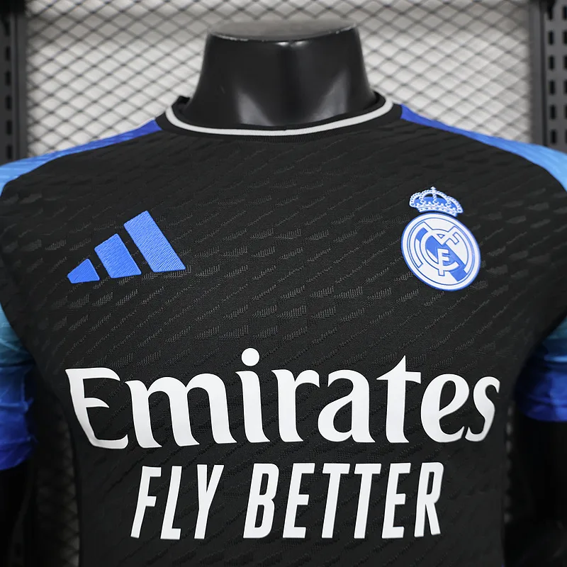 The Real Madrid 2024/25 Special Edition Black & Blue Jersey – Player Version is a true masterpiece that merges bold design with elite craftsmanship. Its sleek black base is enhanced by striking blue accents, creating a dynamic and eye-catching aesthetic that symbolizes power and prestige. This exclusive jersey celebrates Real Madrid’s illustrious legacy while showcasing a modern edge.
