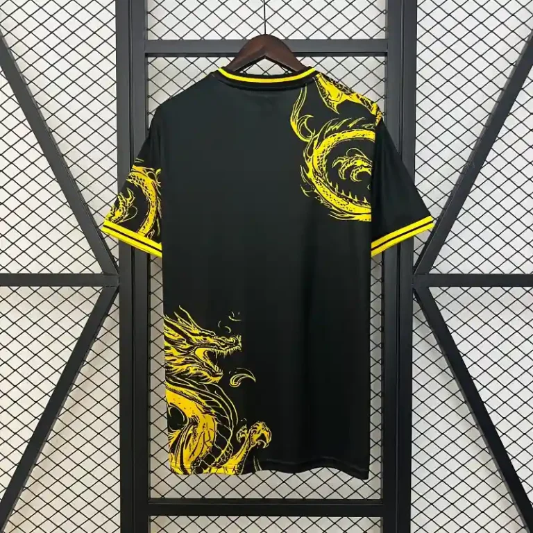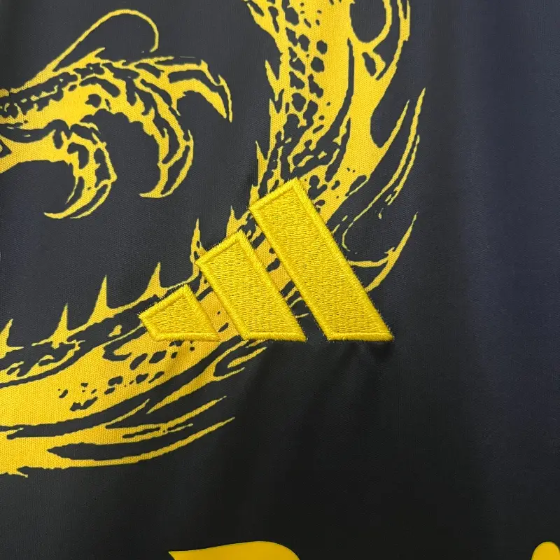 The Real Madrid Yellow Dragon Kit 24/25 – Fan Version is a bold fusion of football heritage and modern design, perfect for fans who cherish the artistry of the game. The vivid yellow base is adorned with an intricate dragon motif, symbolizing strength, resilience, and the fearless spirit of Real Madrid.